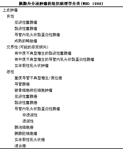 自1982年MTP被报道以来,l学者们对其提出了许多分类法,l多数是根据形态学或组织病理学作出。其中较为经典的是Kuroda于1988年提出的分类标准。他把MTP分为3类:i①主胰管型,l即主胰管扩张,l肿瘤主要位于主胰管内;②支胰管型,l即仅有支胰管扩张,l肿瘤不在主胰管内;③混合型,l即主、i支胰管内均有肿瘤。1996年,l世界卫生组织(WHO)对胰腺外分泌肿瘤提出了新的组织病理学分类方法(表2-63)。该分类法以“导管内乳头状黏蛋白性肿瘤”的名称把胰腺产黏蛋白肿瘤分为良性、i交界性和恶性。其中交界性是指具有中度不典型增生病变,l有恶变倾向的肿瘤。